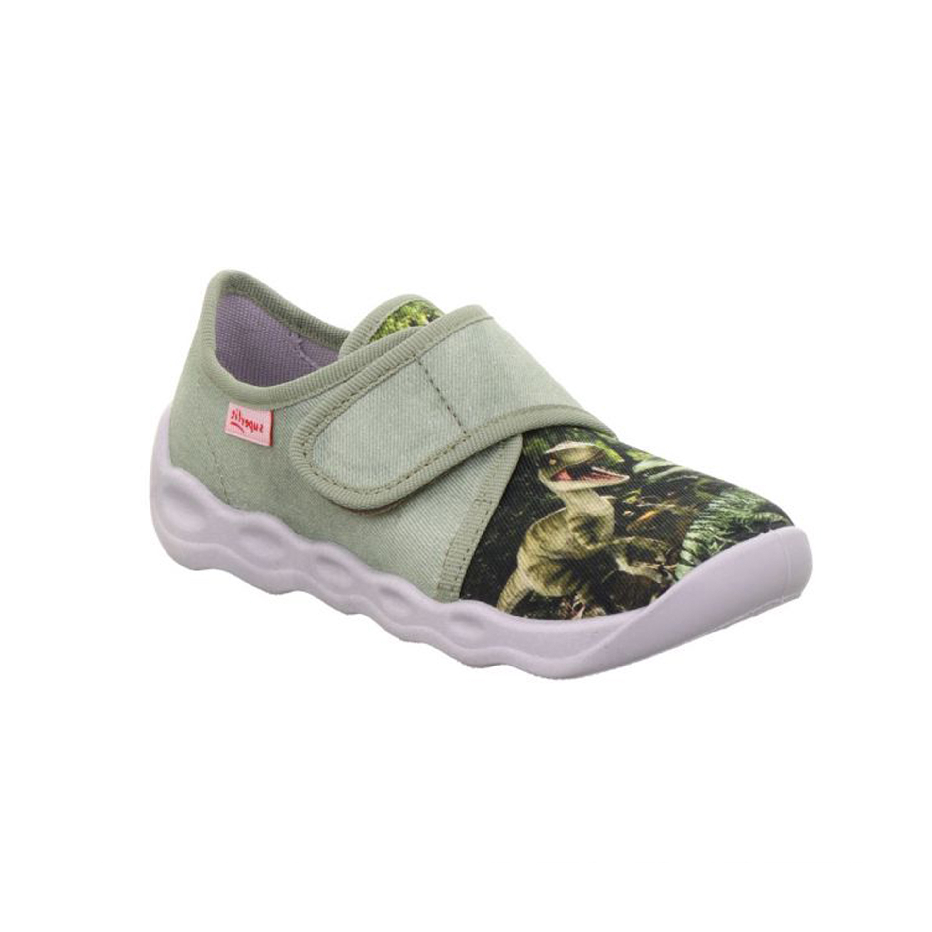 Hausschuh für Jungen, Obermaterial Textil mit Aufdruck Dino, Klettverschluss, Gummisohle, grün, Superfit