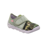 Hausschuh für Jungen, Obermaterial Textil mit Aufdruck Bagger, Klettverschluss, Gummisohle, grün- orange, Superfit
