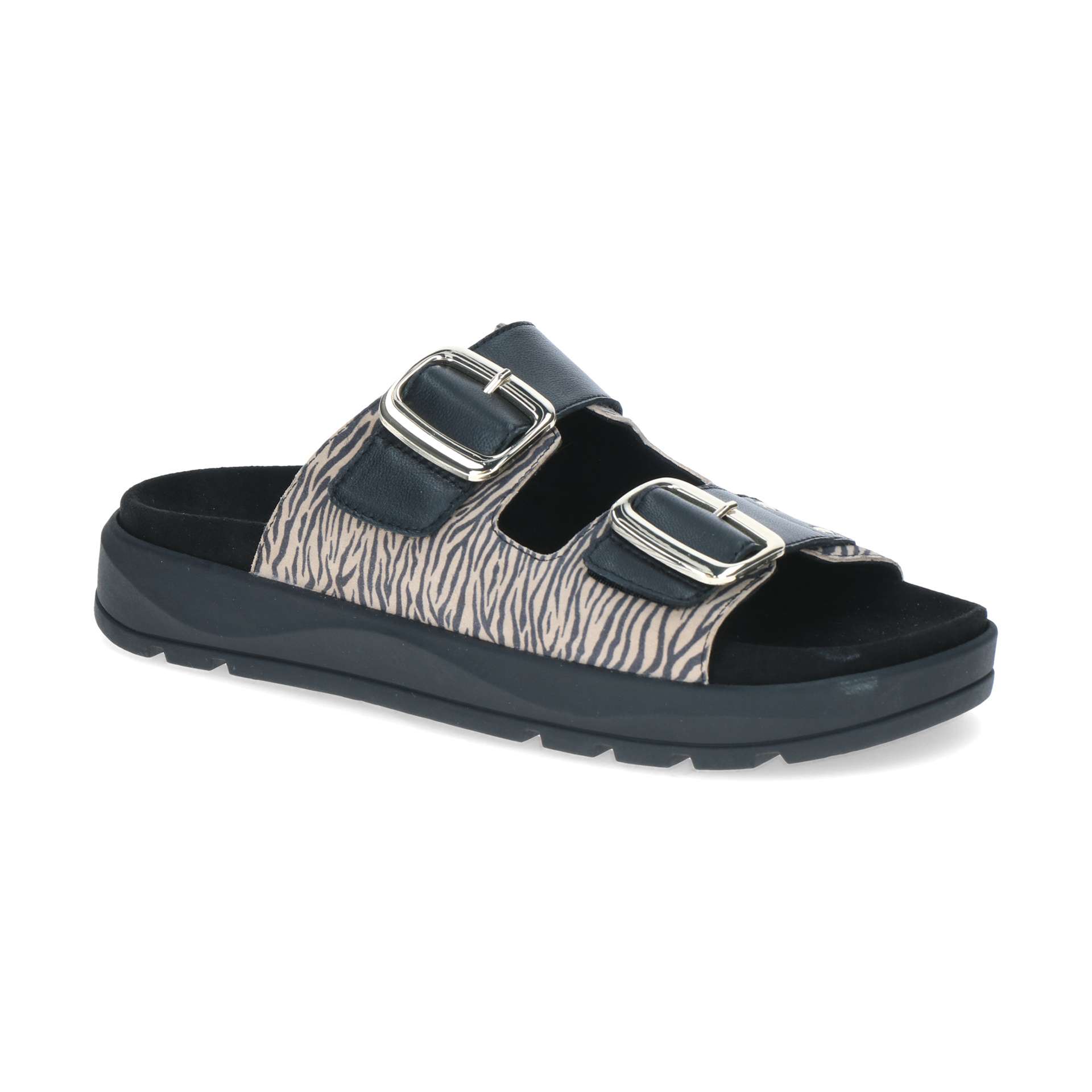 Pantolette mit zwei Klettverschlüssen, dicke Sohle, Obermaterial Nubukleder, Wechselfußbett, schwarz- beige mit Zebradruck, Goldschnallen, Rohde