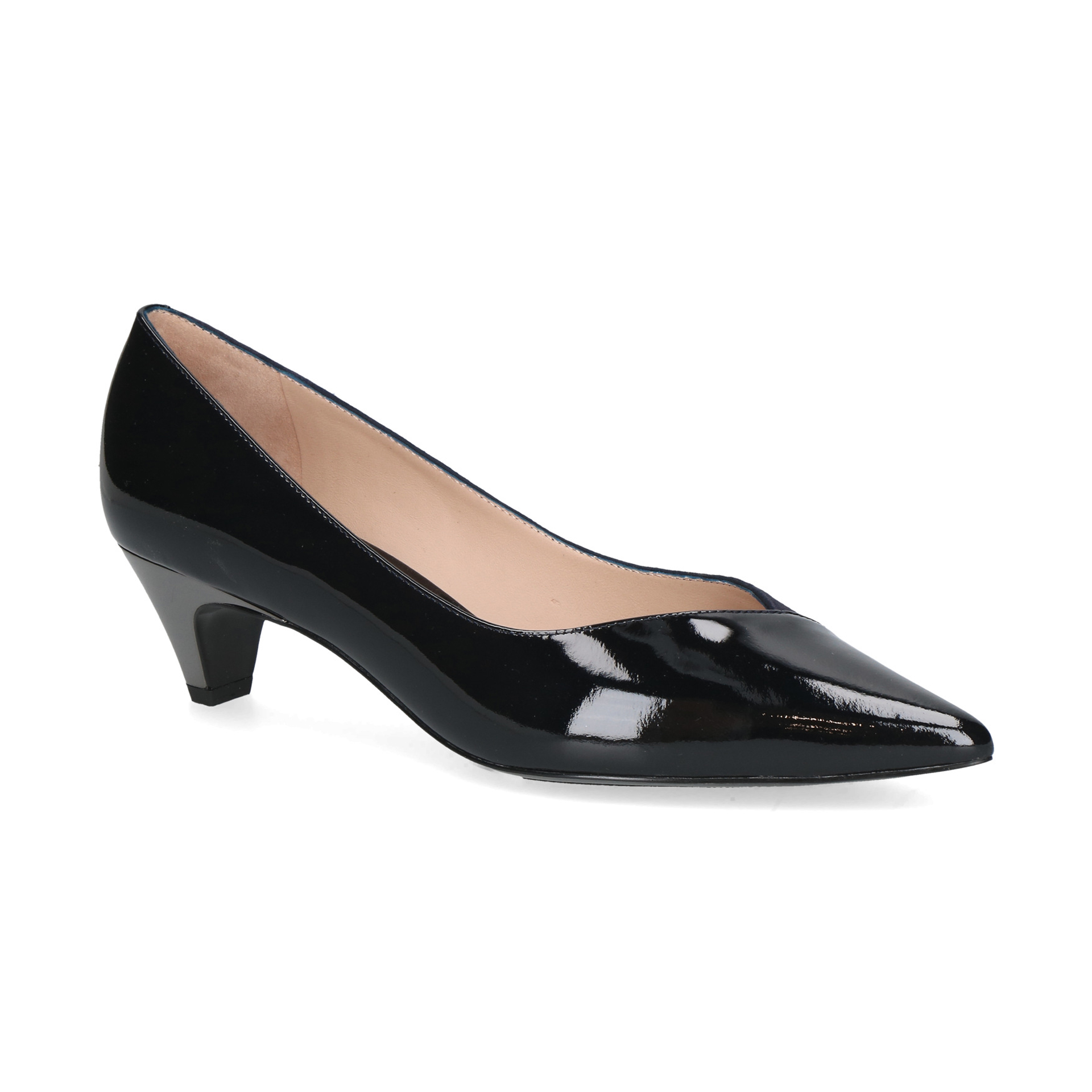 spitzer Pumps mit kleinem schlankem Absatz in mittlerer Höhe, dunkelblau, Nubuk- und Lackleder, Peter Kaiser