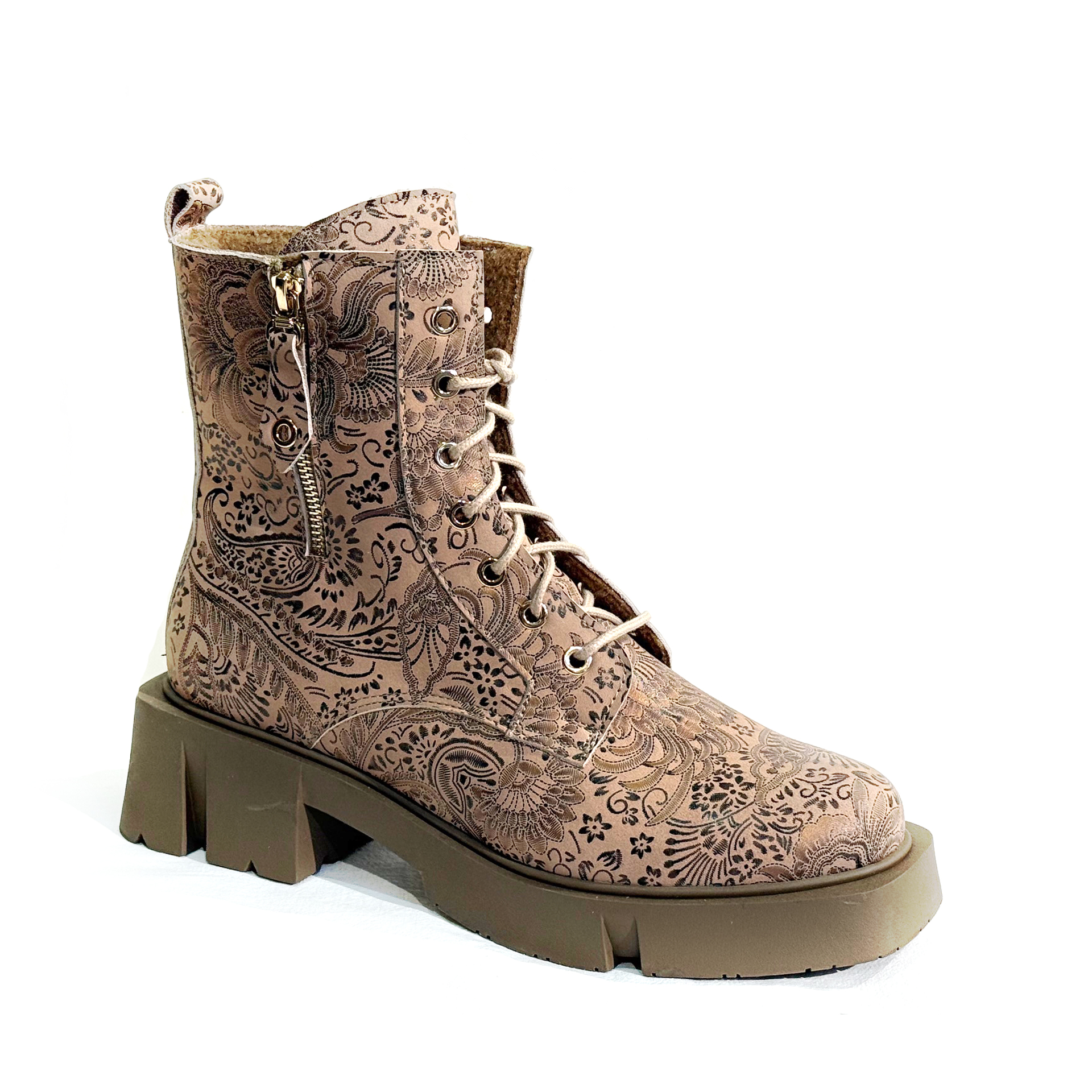 Schnürstiefelette mit flachem Absatz und dicker Sohle, Reißverschluss, leicht gefüttert, cremefarbenes, kupferfarben bedrucktes Nubukleder, Contes