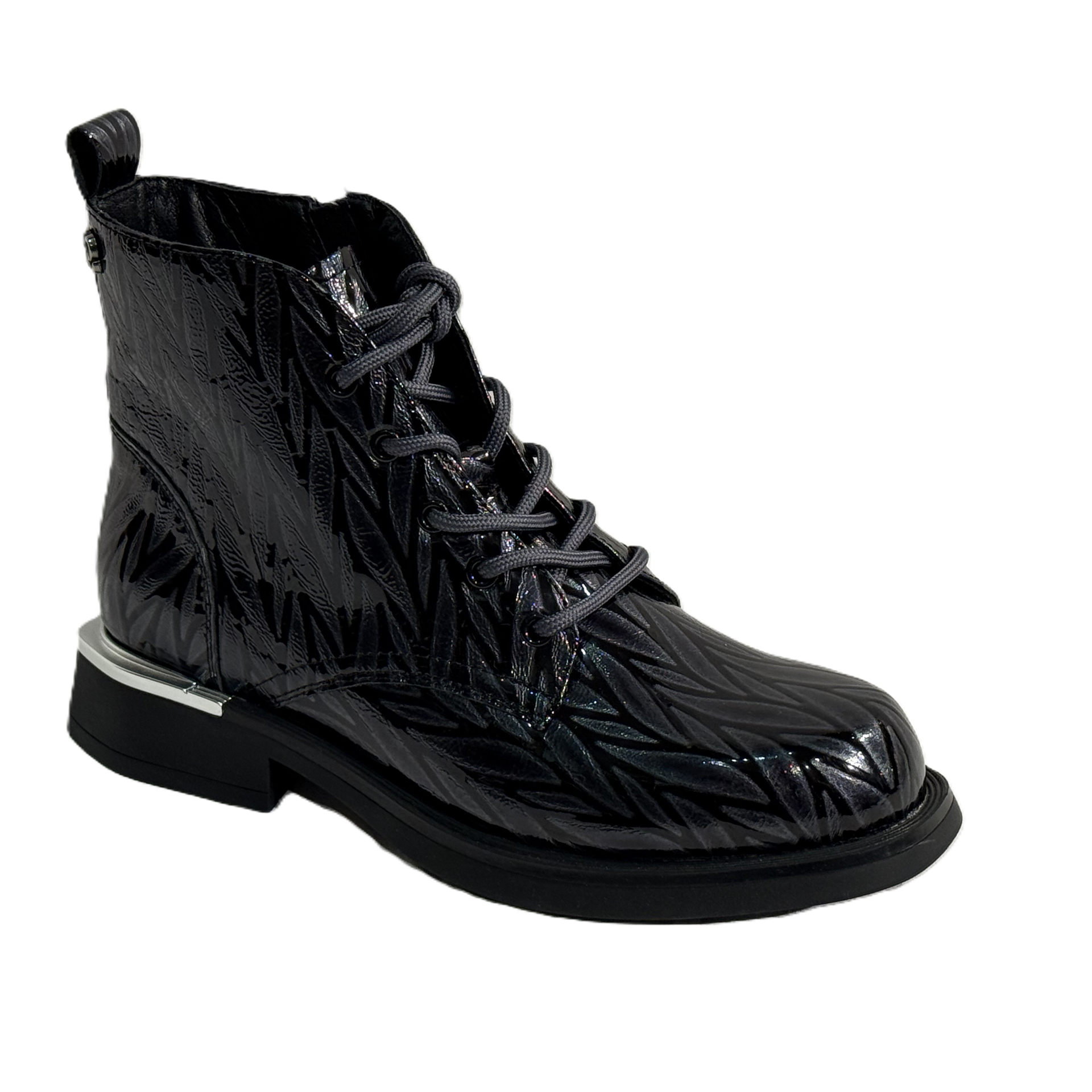 Schnürstiefelette mit flachem Absatz, Reißverschluss, leicht gefüttert, Lackleder geprägt, schwarz- grau,  Artiker