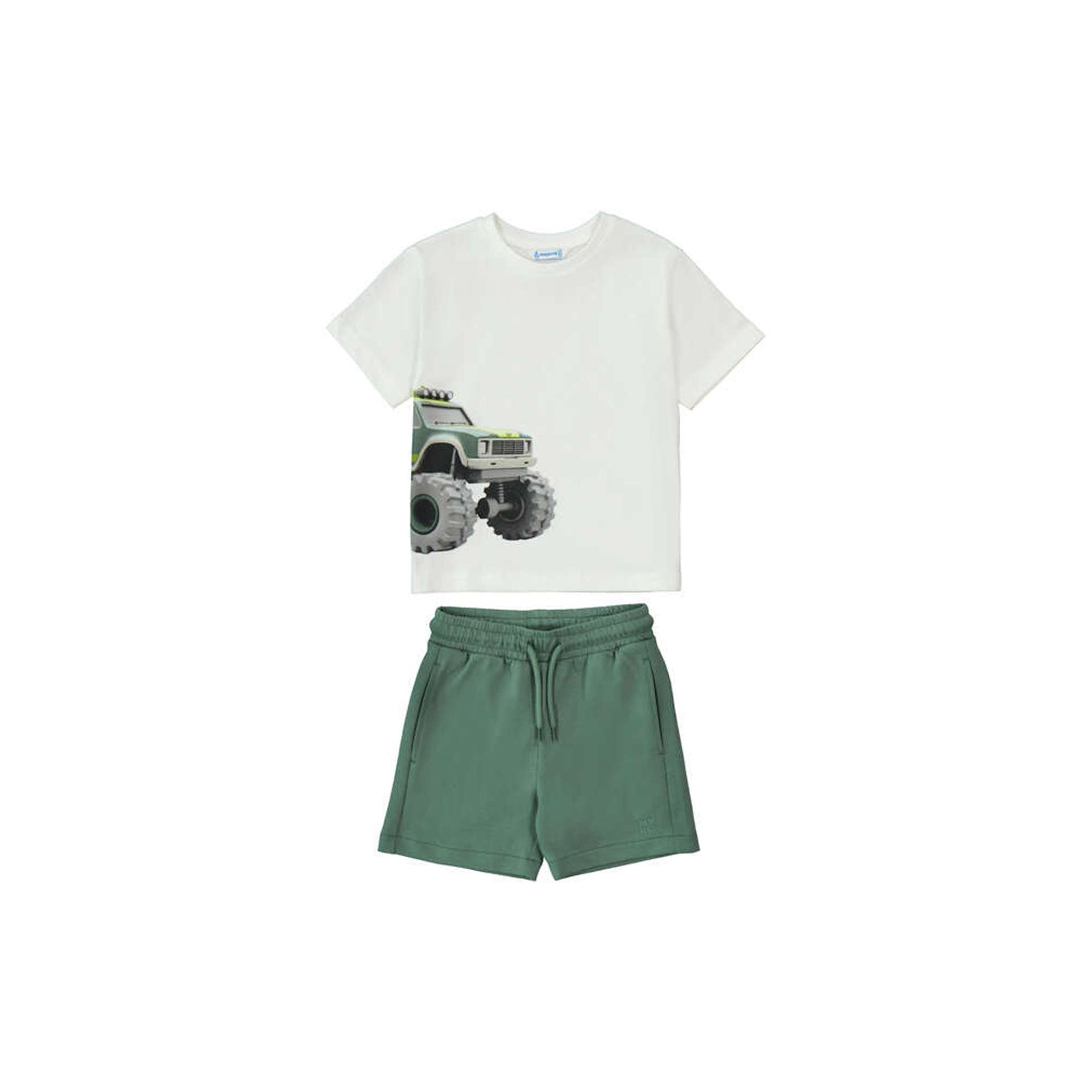 Set bestehend aus grüner, kurzer Hose und  T- Shirts in weiß mit Aufdruck Truck,  Mayoral